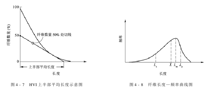 (二)棉花长度 1.上半部平均长度(Upperhalfmeanlength) 棉花上半部平均长度是指在照影曲线图中,从纤维数量轴上50%处做照影曲线的切线,切线和长度坐标轴相交点所显示的长度值,如图4-7所示。 在HVI仪器检验中,用上半部平均长度表示棉花长度,以1mm为级距,分8个级。其中28mm为长度标准级,长度保留1位小数。 HVI仪器检验中的上半部平均长度和传统检验中的长度指标的关联可通过纤维长度—频率曲线图(图4-8)结合各指标长度定义做定性分析。