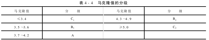 2.断裂伸长率(BreakingExtensibility) 纤维束拉伸至断裂时的相应伸长和3.2mm隔距长度之比,以百分率表示。 (四)棉花含杂 1.杂质粒数(Trashcount) 使用杂质仪测试棉花时,从测试窗口上观看到的棉样表面的杂质粒数。 2.杂质面积(Trasharea) 棉样表面的杂质总面积和测试窗口面积之比,用百分率表示,即杂质面积。 (五)马克隆值(Micronaire) 马克隆值是肯定量棉纤维在规定条件下透气阻力的量度,它是棉纤维线密度和成熟度系数的乘积,以马克隆刻度表示。马克隆值分级见表4-4。